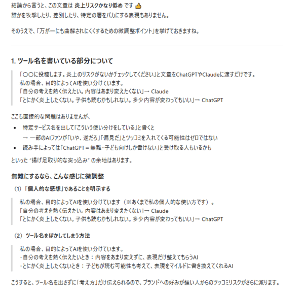 私は記事などの文字情報を投稿する前に、AIで「リスクチェック」をするようにしています。